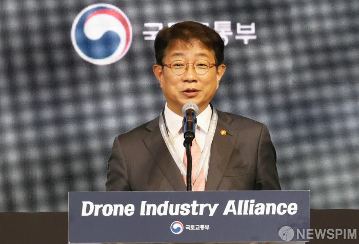 [서울=뉴스핌] 양윤모 기자 = 박상우 국토교통부 장관이 14일 오후 서울 강서구 마곡 코엑스에서 개최된 '드론산업 얼라이언스(Drone Industry Alliance, DIA) 창립총회' 행사에 참석 창립선언을 하고 있다. 국토교통부는 이번 행사에서 농업과 소방, 건설·시설 관리, 물류, 항공 드론을 국산 기술로 개발하기 위한 ‘드론 완성체 5대 프로젝트’를 공개했다. 2025.05.14 yym58@newspim.com