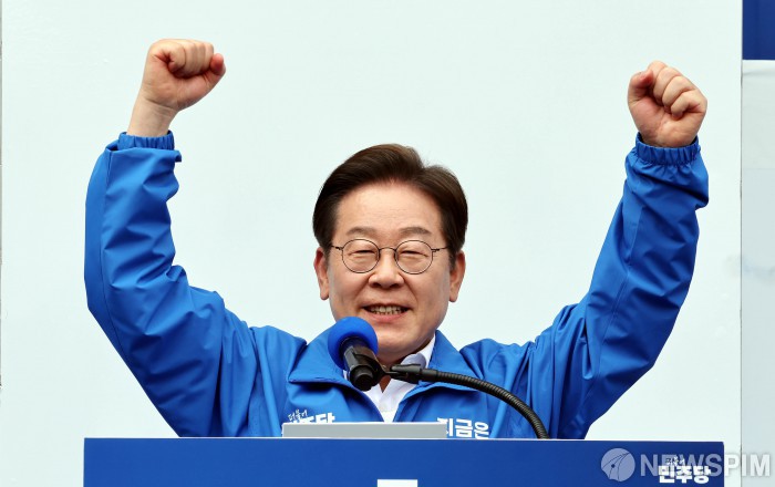 [창원=뉴스핌] 정일구 기자 = 이재명 더불어민주당 대선후보가 14일 창원시 상산구 상남분수광장에서 열린 집중 유세에서 손을 들어 지지자들에게 인사하고 있다. 2025.05.14 mironj19@newspim.com