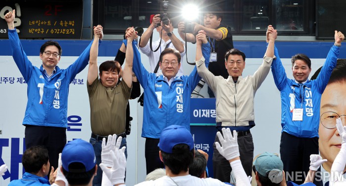 [창원=뉴스핌] 정일구 기자 = 이재명 더불어민주당 대선후보가 14일 창원시 상산구 상남분수광장에서 열린 집중 유세에서 손을 들어 지지자들에게 인사하고 있다. 2025.05.14 mironj19@newspim.com