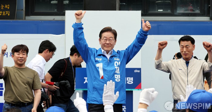 [창원=뉴스핌] 정일구 기자 = 이재명 더불어민주당 대선후보가 14일 창원시 상산구 상남분수광장에서 열린 집중 유세에서 지지를 호소하고 있다. 2025.05.14 mironj19@newspim.com