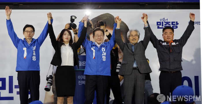 [거제=뉴스핌] 정일구 기자 = 이재명 더불어민주당 대통령 후보가 14일 오후 경남 거제시 엠파크 차없는 거리를 찾아 유세를 하며 시민들에게 인사하고 있다. 2025.05.14 mironj19@newspim.com
