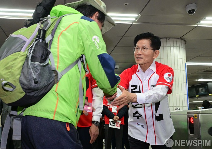 [서울=뉴스핌] 최지환 기자 = 김문수 국민의힘 대통령 후보가 15일 오전 서울 구로구 신도림역에서 출근길 시민들과 인사를 나누고 있다. 2025.05.15 choipix16@newspim.com