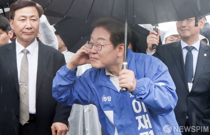 [여수=뉴스핌] 김학선 기자 = 이재명 더불어민주당 대선후보가 15일 전남 여수시 이순신광장 집중유세장에서 유세를 마치고 이동하며 시민들에게 인사하고 있다. 2025.05.15 yooksa@newspim.com