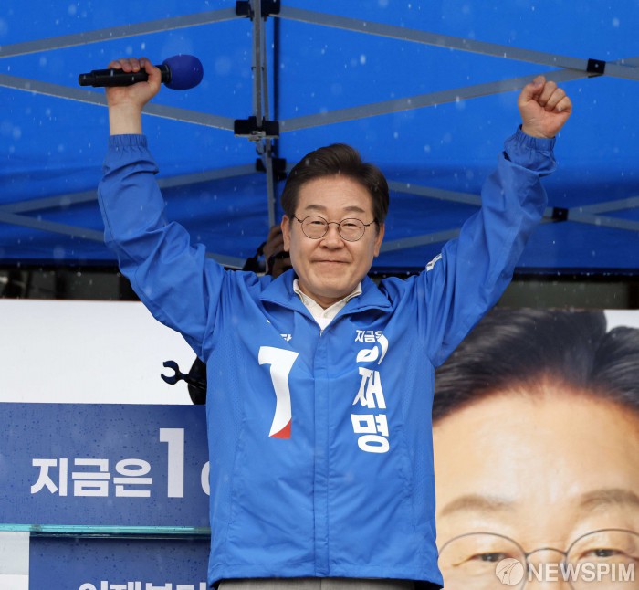 [여수=뉴스핌] 김학선 기자 = 이재명 대선후보가 많은 비가 내린 15일 오후 전남 여수시 이순신 광장에서 시민들에게 인사를 하고 있다. 2025.5.15 yooksa@newspim.com