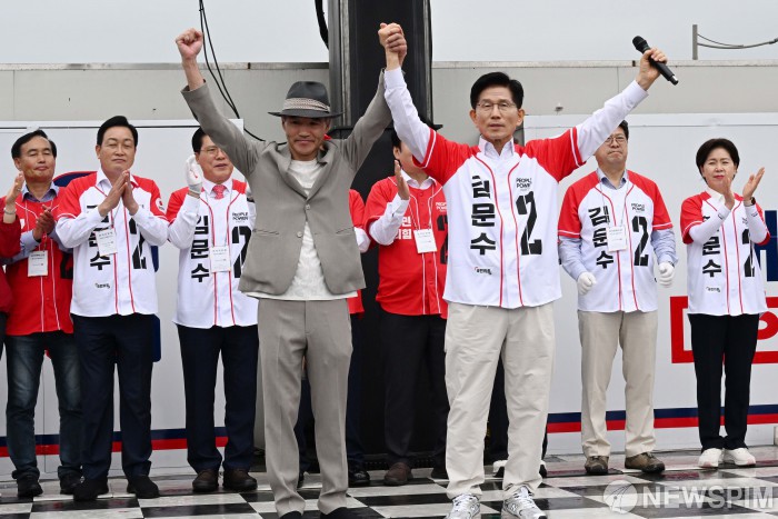 [수원=뉴스핌] 최지환 기자 = 김문수 국민의힘 대선후보가 16일 오전 경기도 수원시 지동시장 유세에서 지지를 호소하고 있다. 2025.05.16 choipix16@newspim.com
