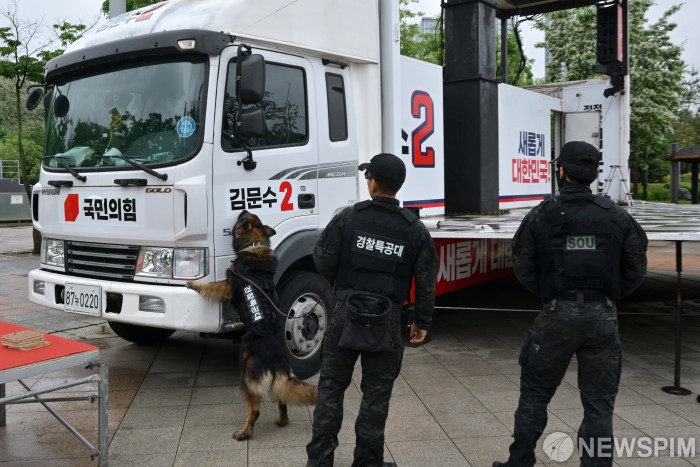 [동탄=뉴스핌] 최지환 기자 =16일 김문수 국민의힘 대선 후보의 집중 유세가 예정된 경기 화성시 동탄센트럴파크에서 경찰특공대가 폭발물 탐지견을 이용해 안전 검측을 하고 있다. 2025.05.16 choipix16@newspim.com