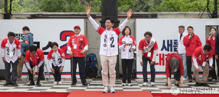[화성=뉴스핌] 최지환 기자 = 김문수 국민의힘 대선 후보가 16일 경기 화성시 동탄센트럴파크에서 열린 유세 현장에서 시민들에게 인사하고 있다. 2025.05.16 choipix16@newspim.com