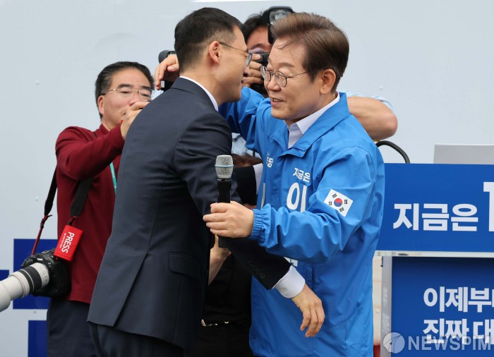 [익산=뉴스핌] 김학선 기자 = 이재명 더불어민주당 대선 후보가 16일 전북 익산역 동부광장 유세에서 최근 국민의힘을 탈당한 김상욱 의원과 포옹하고 있다. 2025.05.16 yooksa@newspim.com