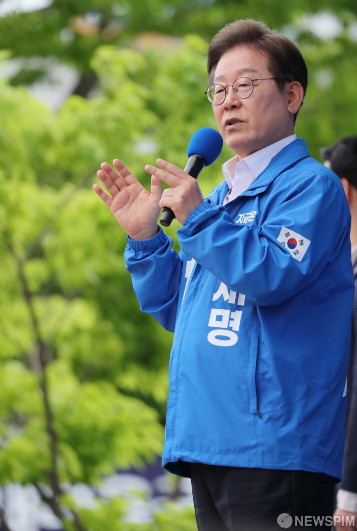 [군산=뉴스핌] 김학선 기자 = 더불어민주당 이재명 대통령 후보가 16일 오전 전북 군산시 구시청광장에서 열린 집중유세에 참석, 유권자들의 지지를 호소하고 있다. 2025.05.16 yooksa@newspim.com