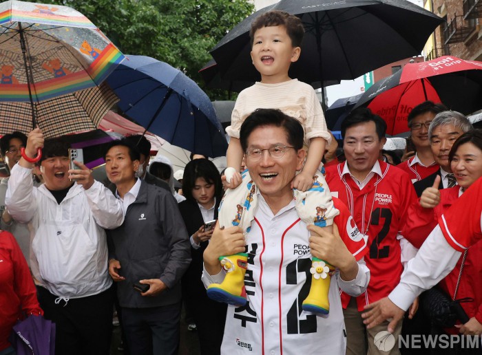 [대전=뉴스핌] 최지환 기자 = 김문수 국민의힘 대선 후보가 16일 오후 대전 중구 중앙로역 으능정이 문화의거리를 찾아 한 아이를 목말을 태워주며 시민들과 인사를 나누고 있다. 2025.05.16 choipix16@newspim.com