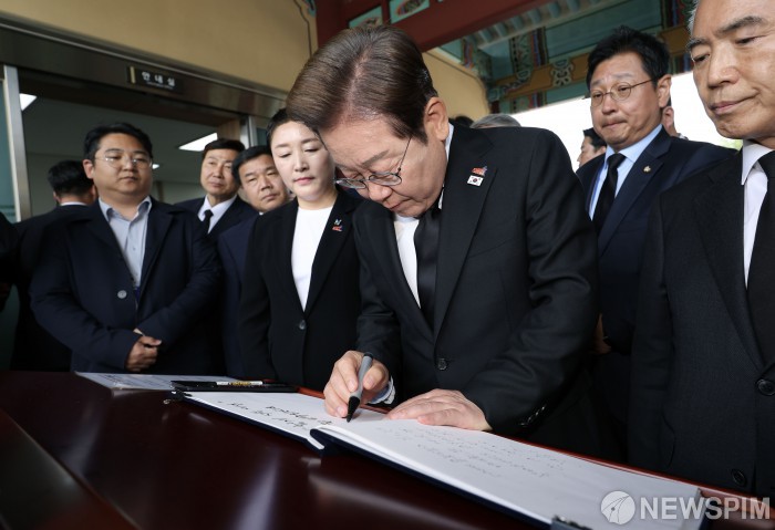 [광주=뉴스핌] 이형석 기자 = 이재명 더불어민주당 대선 후보가 17일 오후 광주광역시 북구 국립 5.18 민주묘역을 찾아 방명록을 작성하고 있다. 2025.05.17 leehs@newspim.com