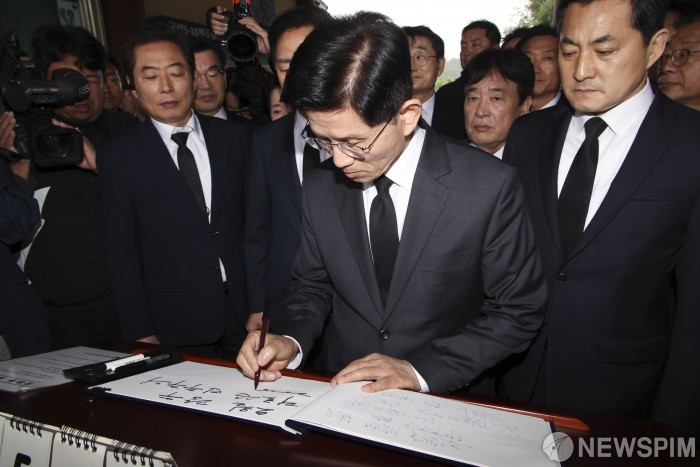 [광주=뉴스핌] 이길동 기자 = 김문수 국민의힘 대선 후보가 17일 오전 광주시 북구 국립 5.18 민주묘지를 방문해 방명록을 작성하고 있다. 2025.05.17 gdlee@newspim.com