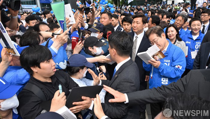 [광주=뉴스핌] 이형석 기자 = 이재명 더불어민주당 대선 후보가 17일 수많은 인파가 운집한 광주 서구 김대중컨벤션센터 광장에서 유세를 마친 뒤 서명 요청에 응하고 있다. 2025.05.17 leehs@newspim.com