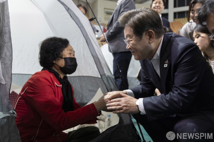 [광주=뉴스핌] 이형석 기자 = 이재명 더불어민주당 대선후보가 17일 광주광역시 광산구 광주여대 체육관에 마련된 금호타이어 공장 화재 이재민 대피소를 찾아 위로하고 있다. 2025.05.17 leehs@newspim.com