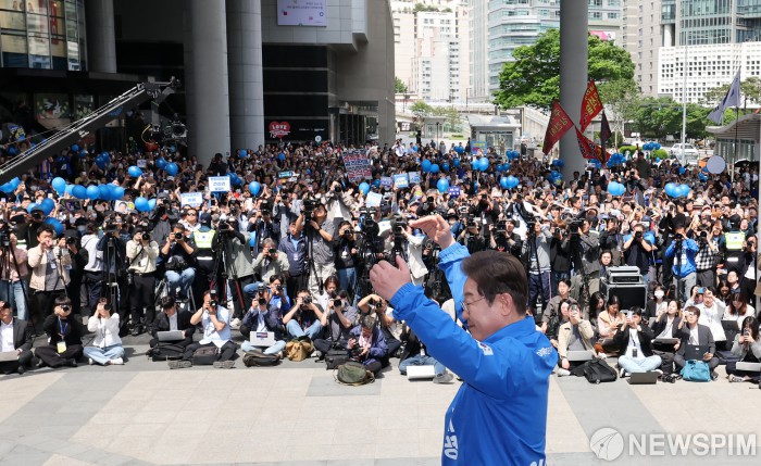 [서울=뉴스핌] 윤창빈 기자 = 이재명 더불어민주당 대선후보가 19일 서울 용산역 광장에서 열린 유세에 입장하며 손을 들고 인사하고 있다. 2025.05.19 pangbin@newspim.com