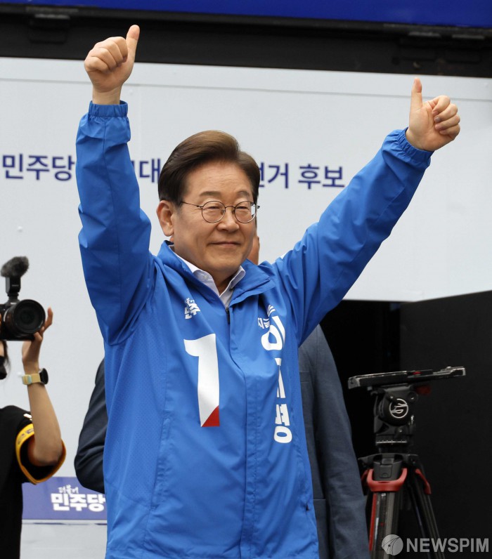 [서울=뉴스핌] 윤창빈 기자 = 이재명 더불어민주당 대선후보가 19일 서울 영등포구 타임스퀘어에서 열린 유세를 마친 뒤 시민들에게 인사를 하고 있다. 2025.05.19 pangbin@newspim.com