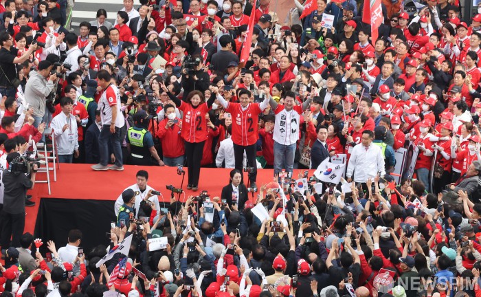 [서울=뉴스핌] 최지환 기자 = 김문수 국민의힘 대선 후보와 나경원, 안철수 공동선거대책위원장이 19일 오후 서울 중구 서울역 광장에서 진행된 “쏘울을 새롭게” 서울역 광장 유세에서 지지를 호소하고 있다. 2025.5.19 choipix16@newspim.com