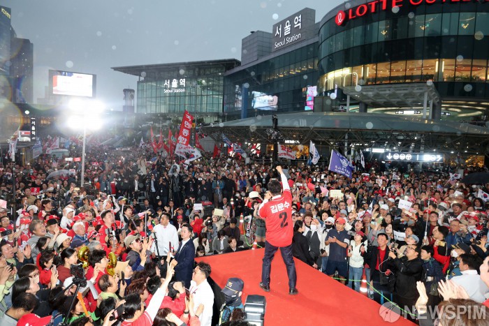 [서울=뉴스핌] 최지환 기자 = 19일 오후 국민의힘 김문수 후보가 "쏘울을 새롭게" 서울역 광장 유세장에서 지지를 호소하고 있다. 2025.05.19 choipix16@newspim.com