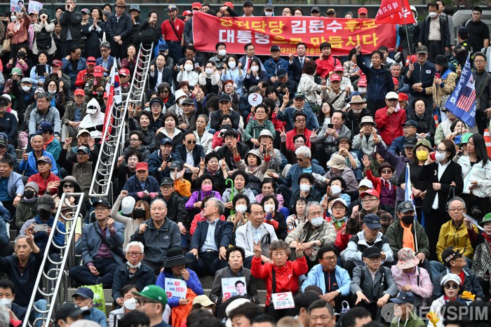 [서울=뉴스핌] 최지환 기자 = 김문수 국민의힘 대선후보를 지지하는 시민들이 19일 서울역 광장 유세에서 기호 2번을 외치고 있다. 2025.05.19 choipix16@newspim.com