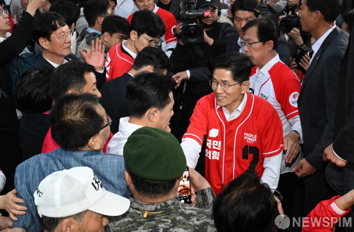[서울=뉴스핌] 최지환 기자 = 김문수 국민의힘 대선후보가 19일 서울역 광장 유세를 마치고 지지자와 악수하고 있다. 2025.05.19 choipix16@newspim.com
