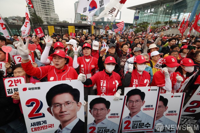 [서울=뉴스핌] 최지환 기자 = 김문수 국민의힘 대통령 후보가 19일 서울역 광장에서 열린 "쏘울을 새롭게" 집중 유세에서 시민들에게 지지를 호소하고 있다. 2025.05.19 choipix16@newspim.com