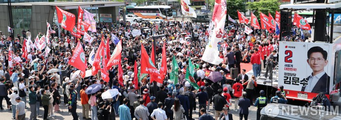 [서울=뉴스핌] 최지환 기자 = 김문수 국민의힘 대선 후보가 20일 서울 서초구 고속터미널역 광장에서 집중유세를 하고 있다. 2025.05.20 choipix16@newspim.com