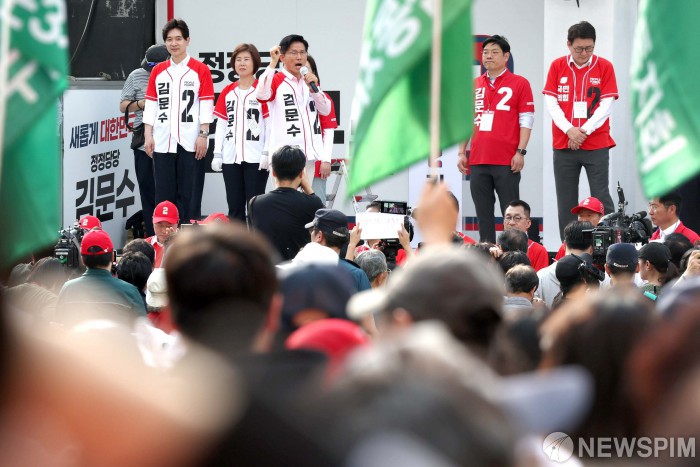 [서울=뉴스핌] 최지환 기자 = 김문수 국민의힘 대선 후보가 20일 오후 서울 강동구 광진교 남단사거리에서 열린 강동을 새롭게 유세에서 시민들에게 지지를 호소하고 있다. 2025.05.20 choipix16@newspim.com