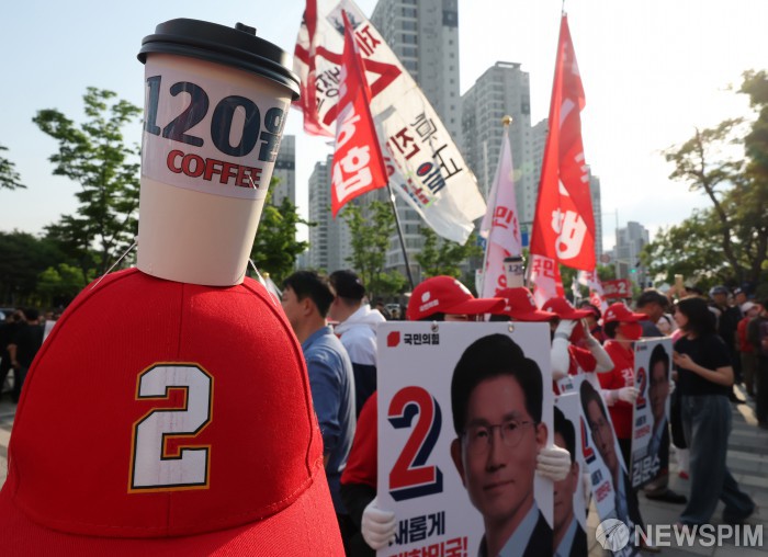 [하남=뉴스핌] 최지환 기자 = 20일 오후 경기도 하남시 김문수 국민의힘 대선 후보 유세장에서 지지자들이 120원이 쓰여진 커피컵을 응원도구로 사용하고 있다. 2025.05.20 choipix16@newspim.com
