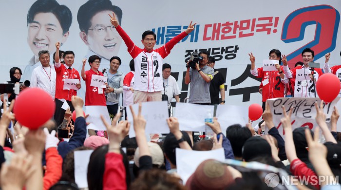 [고양=뉴스핌] 최지환 기자 = 김문수 국민의힘 대통령 후보가 21일 경기 고양시 화정역 문화광장 앞 유세장에서 양팔을 벌려 지지자에게 인사하고 있다. 2025.05.21 choipix16@newspim.com
