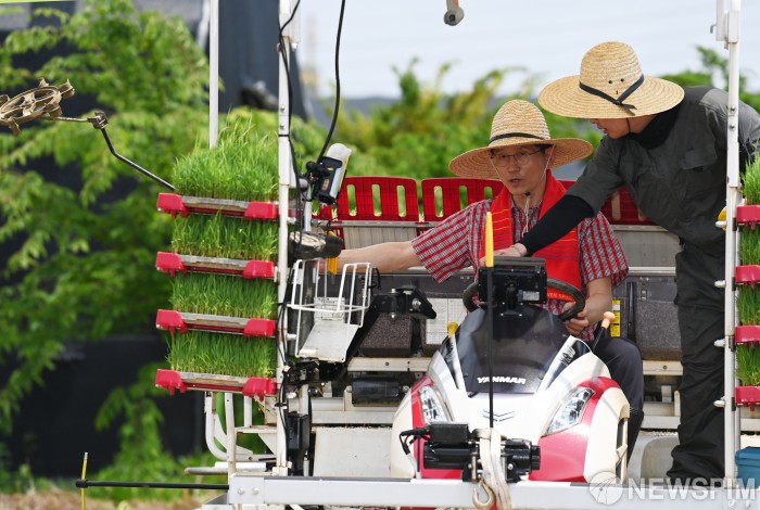 [고양=뉴스핌] 최지환 기자 = 김문수 국민의힘 대선후보가 21일 오후 경기 고양시 덕양구 화정동 일대 논에서 청년농업인과 이앙기에 탑승해 모내기를 하고 있다. 2025.05.21 choipix16@newspim.com