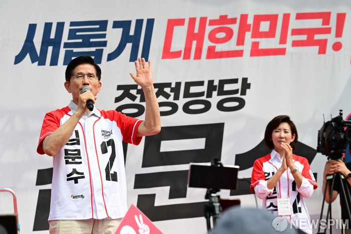 [김포=뉴스핌] 최지환 기자 = 김문수 국민의힘 대선후보가 21일 오후 경기 김포시 김포공설운동장 사우문화체육광장에 마련된 유세 현장에서 지지를 호소하고 있다. 2025.05.21 choipix16@newspim.com