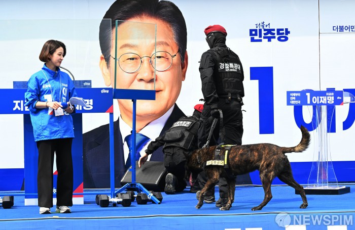 [인천=뉴스핌] 김학선 기자 = 경찰특공대 폭발물탐지견이 21일 인천 부평역 북광장에서 열린 이재명 더불어민주당 대선후보 집중유세에서 연단을 수색하고 있다. 2025.05.21 yooksa@newspim.com