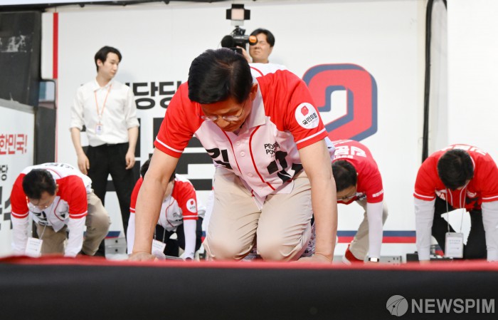 [남양주=뉴스핌] 최지환 기자 = 김문수 국민의힘 대선후보가 21일 오후 경기 남양주시 평내호평역 광장에서 열린 유세현장에서 큰 절을 하고 있다. 2025.05.21 choipix16@newspim.com