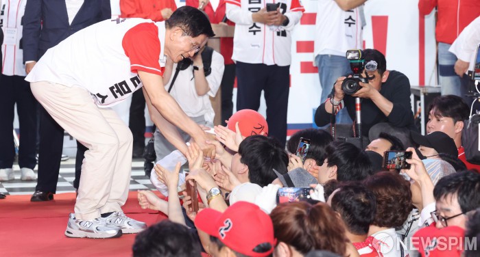 [남양주=뉴스핌] 최지환 기자 = 김문수 국민의힘 대선 후보가 21일 오후 경기 남양주시 평내호평역 광장에서 열린 “더 편하게 더 빠르게” 남양주 유세를 마치고 시민들과 인사하고 있다. 2025.05.21 choipix16@newspim.com