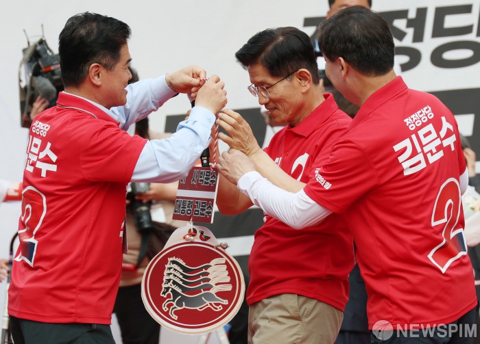 [광명=뉴스핌] 최지환 기자 = 김문수 국민의힘 대선 후보가 22일 경기 광명시 철산로데오거리에서 유세를 하며 마패를 목에 걸고 있다. 2025.05.22 choipix16@newspim.com