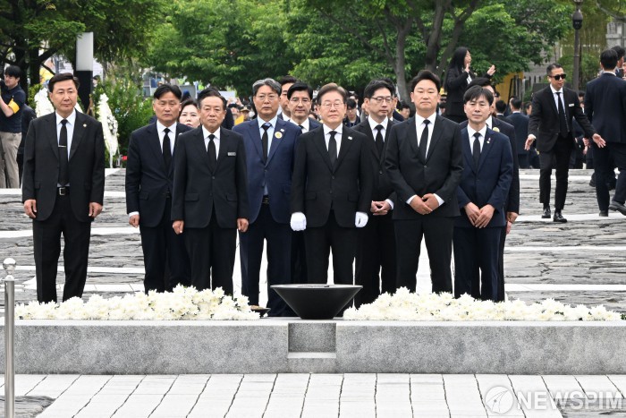 [김해=뉴스핌] 정일구 기자 = 이재명 더불어민주당 대선 후보가 23일 오전 고(故) 노무현 전 대통령 서거 16주기를 맞아 경남 김해시 봉하마을 묘역에 참배하고 있다. 2025.05.23 mironj19@newspim.com