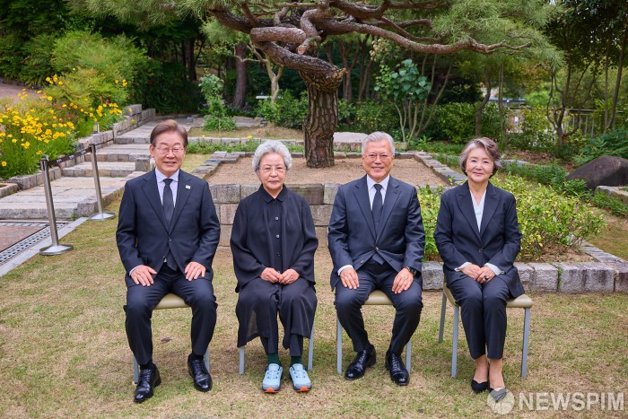 [서울=뉴스핌] 이재명 더불어민주당 대선 후보가 고(故) 노무현 대통령 16주기 인 23일 오후 경남 김해 봉하마을에서 권양숙 여사를 예방해 문재인 전 대통령, 김정숙 여사와 함께 기념촬영을 하고 있다. [사진=더불어민주당] 2025.05.23 photo@newspim.com