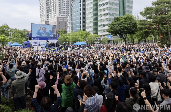 [안양=뉴스핌] 이호형 기자 = 이재명 더불어민주당 대선후보가 24일 경기 안양시 평촌중앙공원 집중유세 현장을 찾아 지지를 호소하고 있다. 2025.05.24 leemario@newspim.com