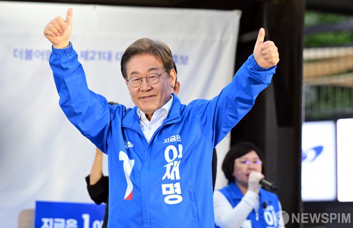 [안산=뉴스핌] 이호형 기자 = 이재명 더불어민주당 대선 후보가 24일 오후 경기도 안산시 안산문화광장 유세를 마친 뒤 지지자들을 향해 엄지를 들어보이고 있다. 2025.05.24 leemario@newspim.com