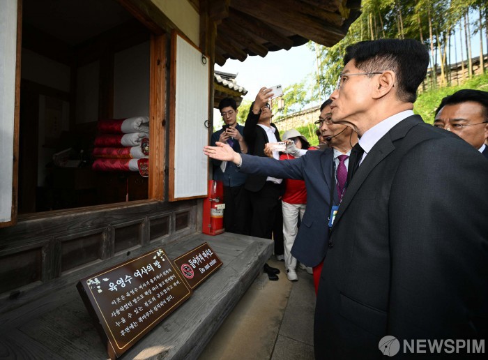 [옥천=뉴스핌] 최지환 기자 = 김문수 국민의힘 대선 후보가 25일 오전 충북 옥천군 육영수 여사 생가를 찾아 관계자의 설명을 들으며 생가를 둘러보고 있다. 2025.05.25 choipix16@newspim.com