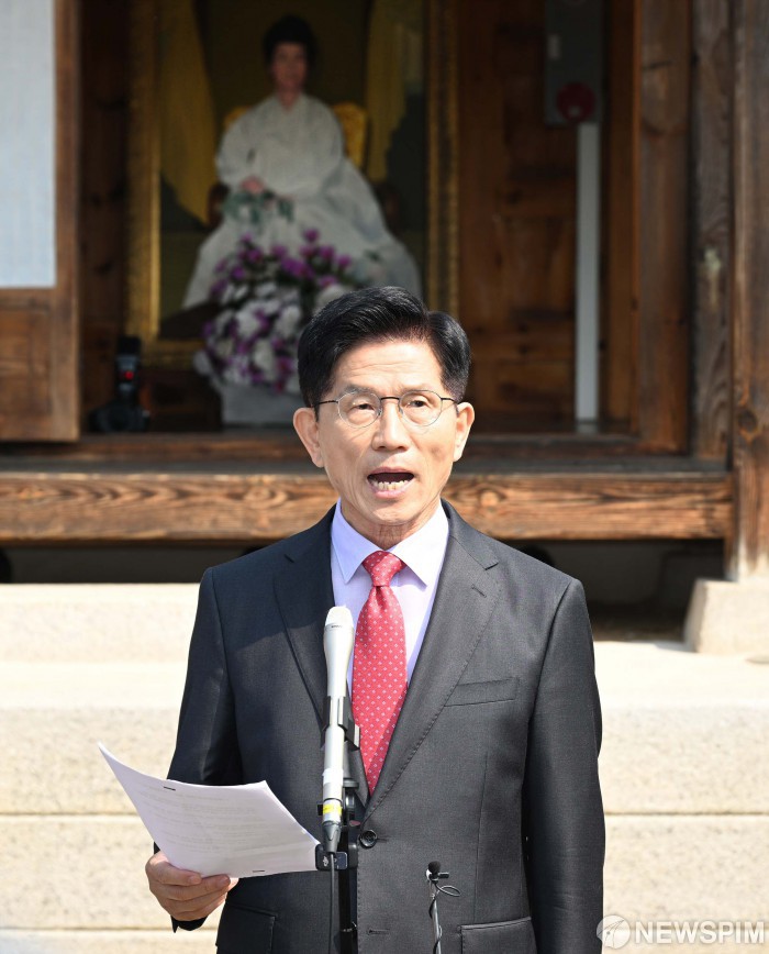 [옥천=뉴스핌] 최지환 기자 = 김문수 국민의힘 대선 후보가 25일 오전 충북 옥천군 육영수 여사 생가를 찾아 참배한 뒤 현안 관련 입장을 발표하고 있다. 2025.05.25 choipix16@newspim.com