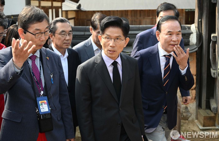 [옥천=뉴스핌] 최지환 기자 = 김문수 국민의힘 대선 후보가 25일 오전 충북 옥천군 육영수 여사 생가를 찾아 관계자의 설명을 들으며 생가를 둘러보고 있다. 2025.05.25 choipix16@newspim.com
