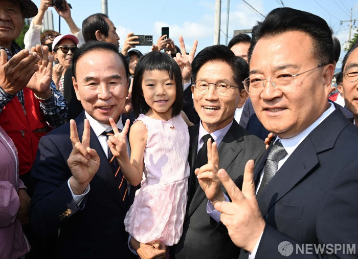 [옥천=뉴스핌] 최지환 기자 = 김문수 국민의힘 대선 후보가 25일 오전 충북 옥천군 육영수 여사 생가 참배에 앞서 아이를 안고 기념촬영을 하고 있다. 2025.05.25 choipix16@newspim.com