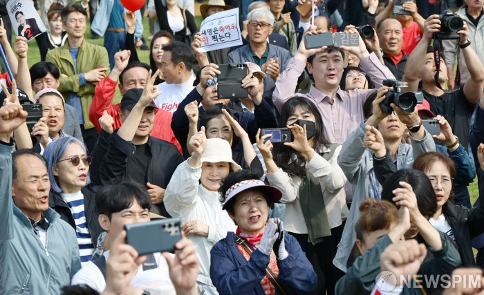[옥천=뉴스핌] 최지환 기자 = 김문수 국민의힘 대선 후보가 25일 충북 옥천군 육영수 여사 생가를 방문해 둘러본 후 생가 앞 유세차량에서 지지를 호소하는 가운데 유권자들이 이를 지켜보고 있다. 2025.05.25 choipix16@newspim.com