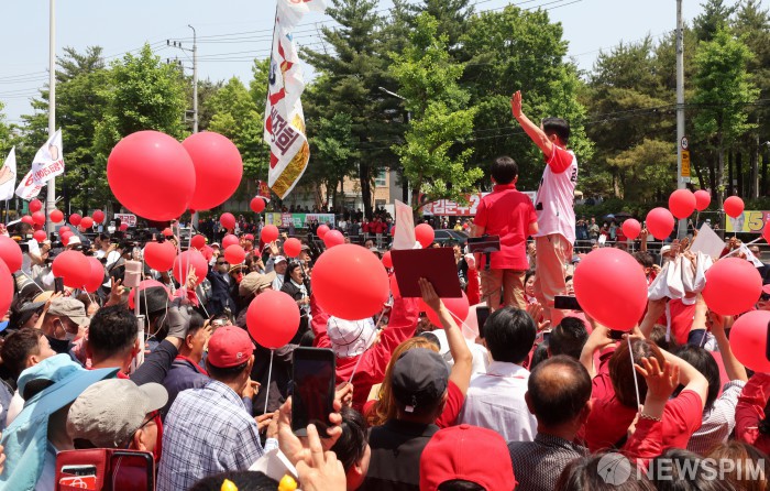 [논산=뉴스핌] 최지환 기자 = 김문수 국민의힘 대선후보가 25일 오전 충남 논산시 홈플러스 논산점 앞에서 열린 유세 현장에서 시민들과 인사하고 있다. 2025.05.25 choipix16@newspim.com