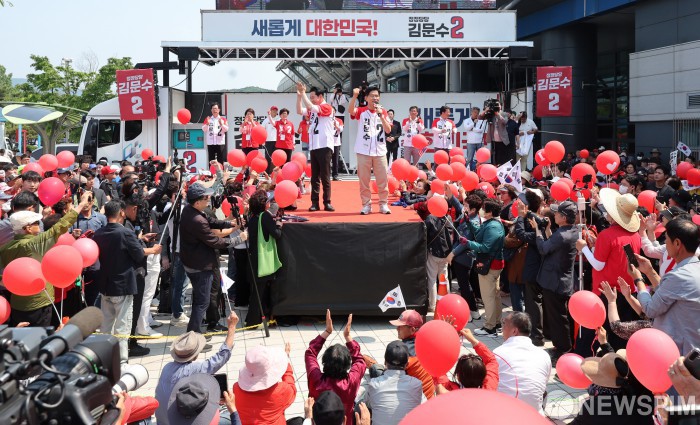 [보령=뉴스핌] 최지환 기자 = 김문수 국민의힘 대선후보가 25일 오후 충남 보령시 대천역 광장에서 열린 유세 현장에서 지지를 호소하고 있다. 2025.05.25 choipix16@newspim.com