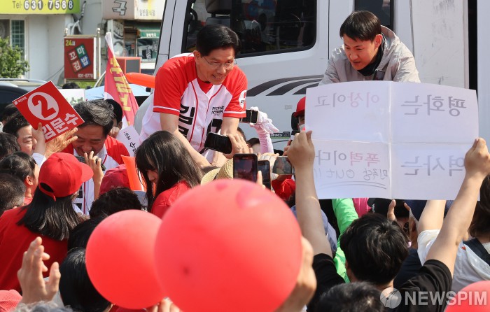 [홍성=뉴스핌] 최지환 기자 = 김문수 국민의힘 대선 후보가 25일 오후 충남 홍성군 홍성천 복개주차장에서 열린 “기적으로 만들 진짜 홍성” 집중유세에서 유권자들과 인사를 나누고 있다. 2025.05.25 choipix16@newspim.com