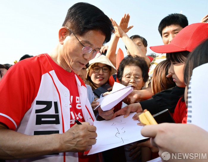 [홍성=뉴스핌] 최지환 기자 = 김문수 국민의힘 대선 후보가 25일 충남 홍성군 홍성읍 내포로에서 유세를 마치고 차로 이동하며 어린이 등 지지자들에게 사인을 해주고 있다. 2025.05.25 choipix16@newspim.com
