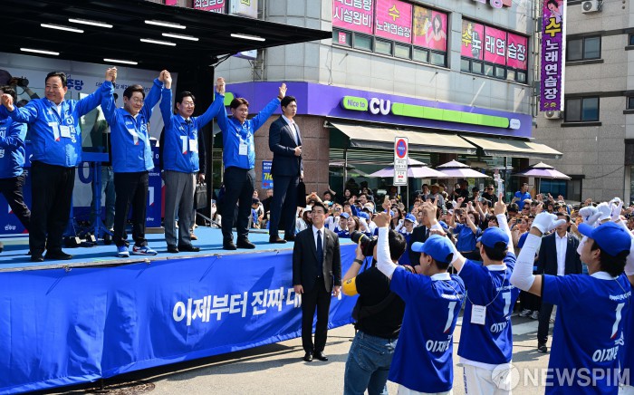 [당진=뉴스핌] 김학선 기자 = 이재명 더불어민주당 대선 후보가 25일 오후 충남 당진전통시장 유세장에서 지지를 호소하고 있다. 2025.05.25 yooksa@newspim.com