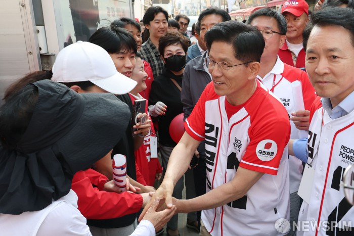[서산=뉴스핌] 최지환 기자 = 김문수 국민의힘 대선 후보가 25일 충남 서산시 중앙통 로데오거리에서 유세를 하며 시민들과 인사를 나누고 있다. 2025.05.25 choipix16@newspim.com